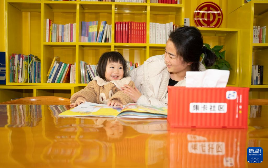 1月8日,在宁波市北仑集运基地后勤区域的职工书屋,卡嫂带着孩子看儿童读物。