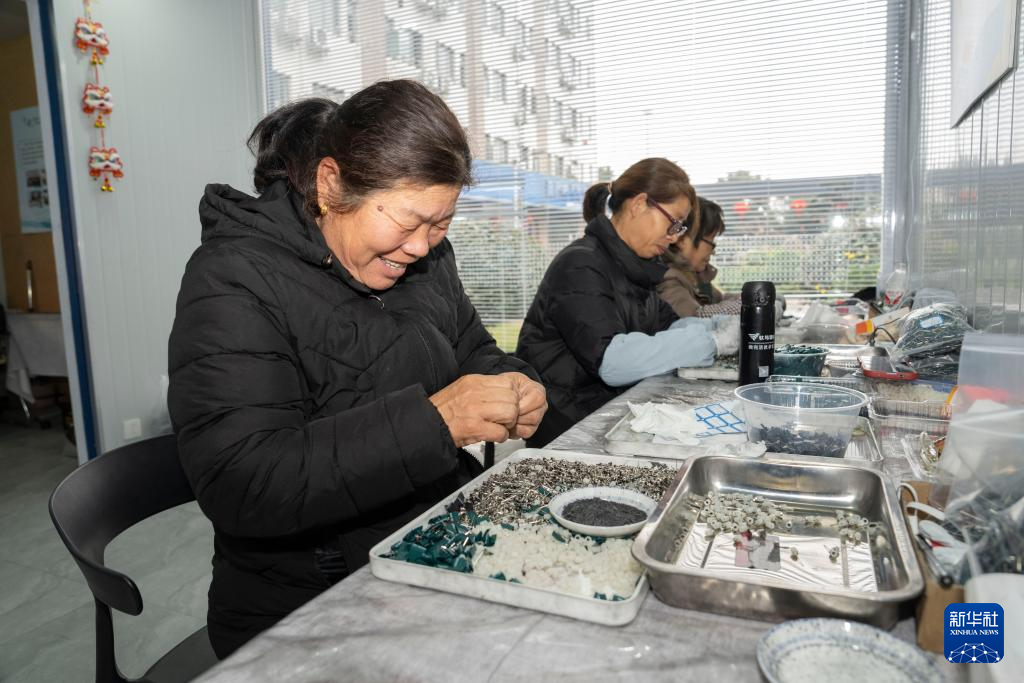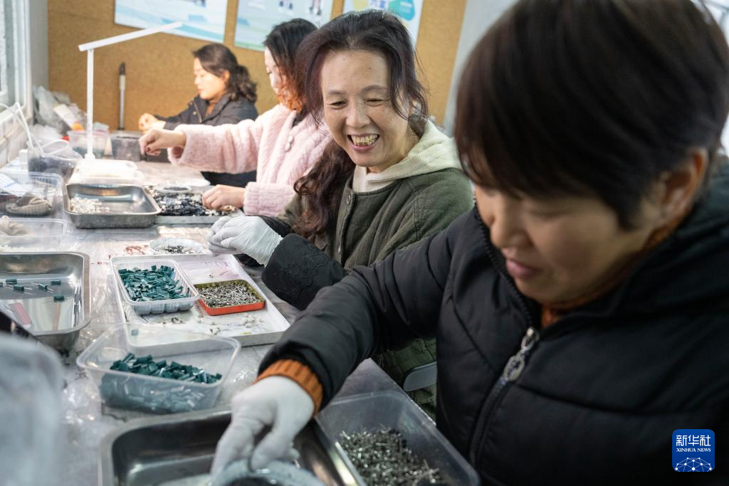 1月8日,在宁波市北仑集运基地后勤区域的卡嫂共富工坊,卡嫂们加工保险箱零配件。