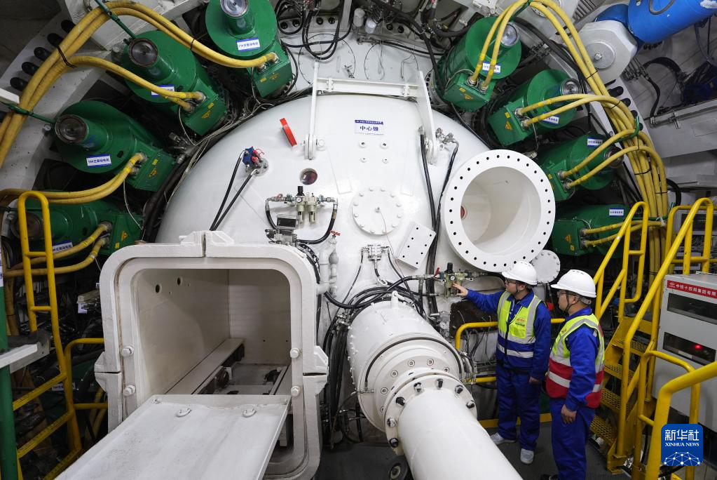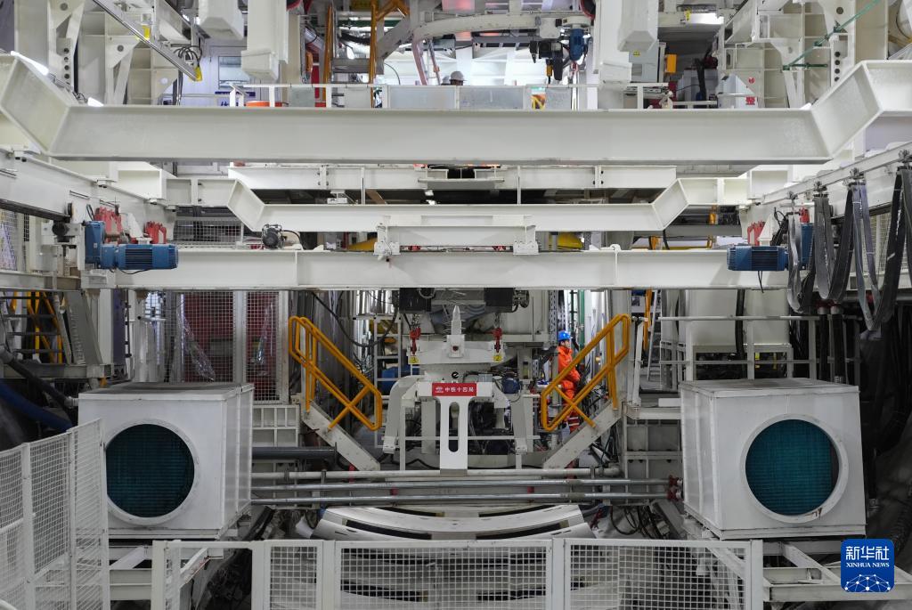 3月29日,中铁十四局技术人员在钱塘江隧道“钱塘号”盾构机内作业。