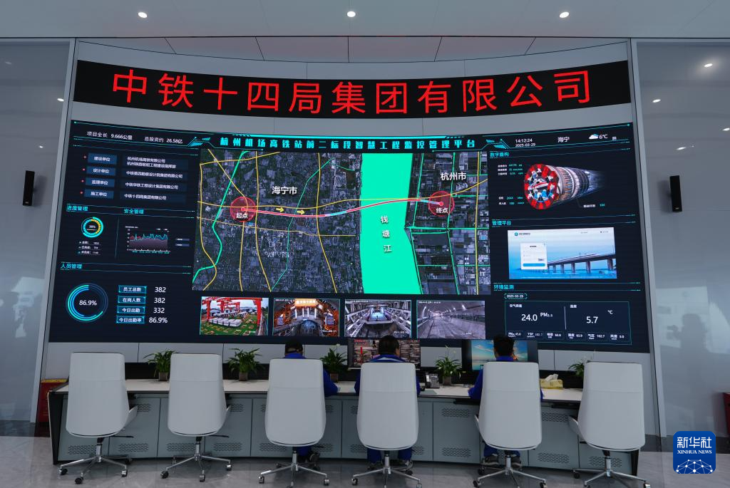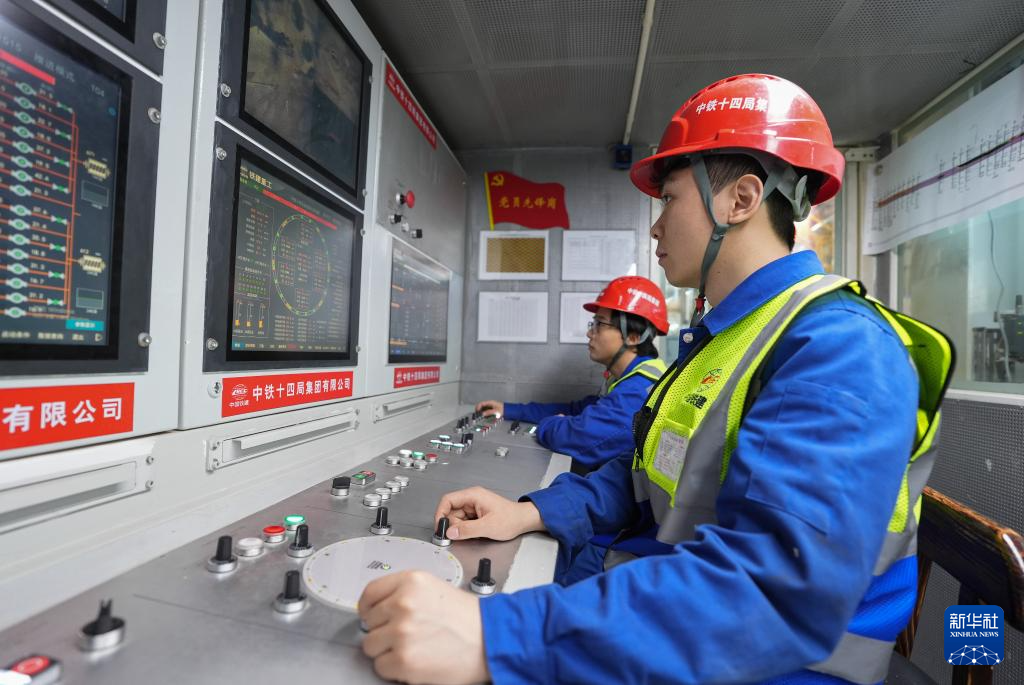3月29日,中铁十四局技术人员在钱塘江隧道“钱塘号”盾构机操作室关注设备运行情况。