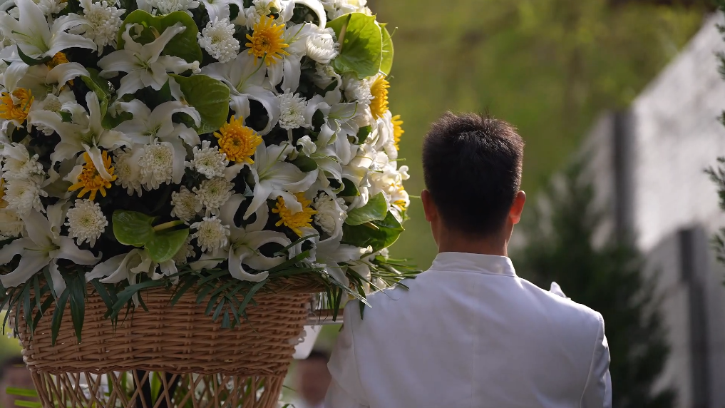 在南京大屠杀遇难者名单墙前,工作人员敬献花篮,全体人员向南京大屠杀死难者鞠躬,死难者遗属代表和学生代表等依次上前献花,表达哀思。
