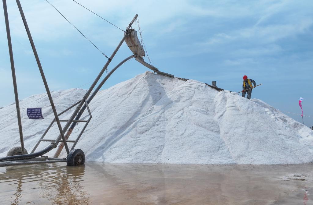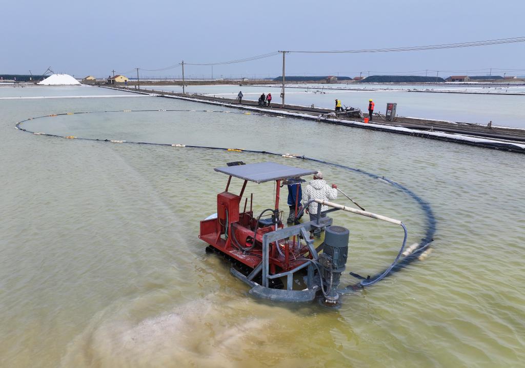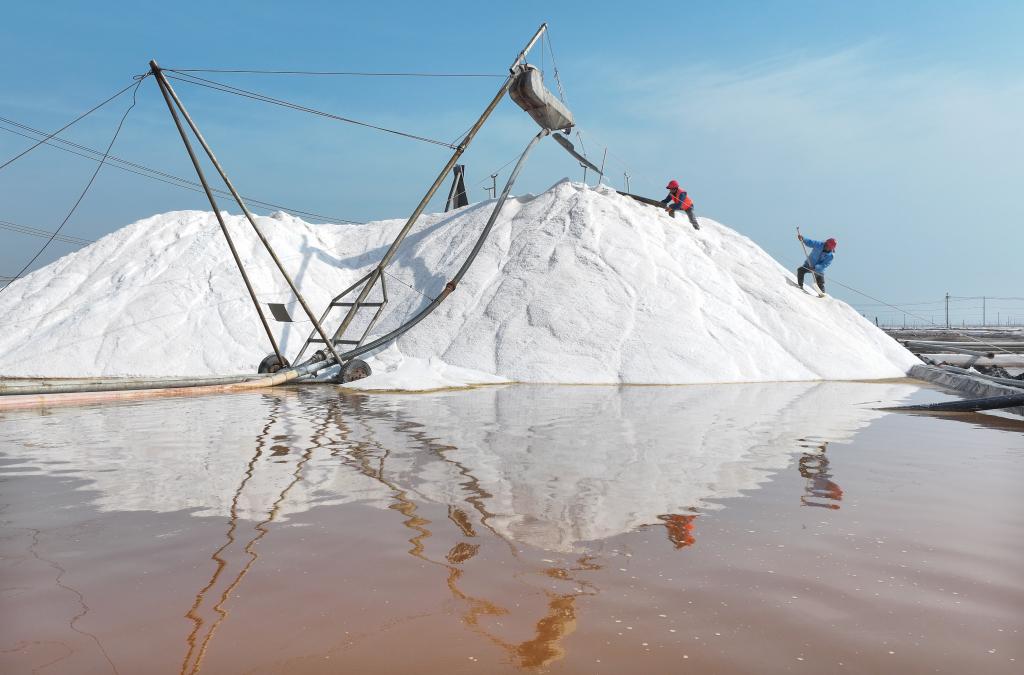 连日来,在江苏省连云港市灌西盐场1.5万亩盐田上,工人们抢抓晴好天气,加紧进行春季扒盐作业。