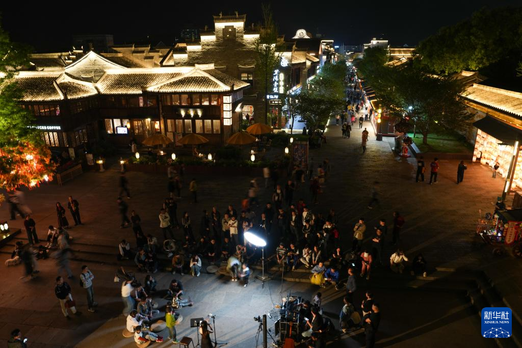 4月8日,人们在浙江省临海市台州府城文化旅游区欣赏一场露天音乐会。