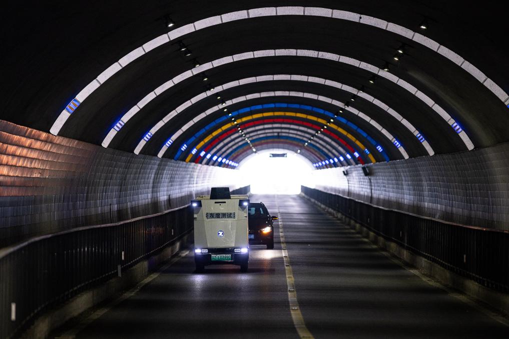 4月9日,智能无人物流车在浙江省湖州市德清县莫干山镇的劳岭隧道内行驶。