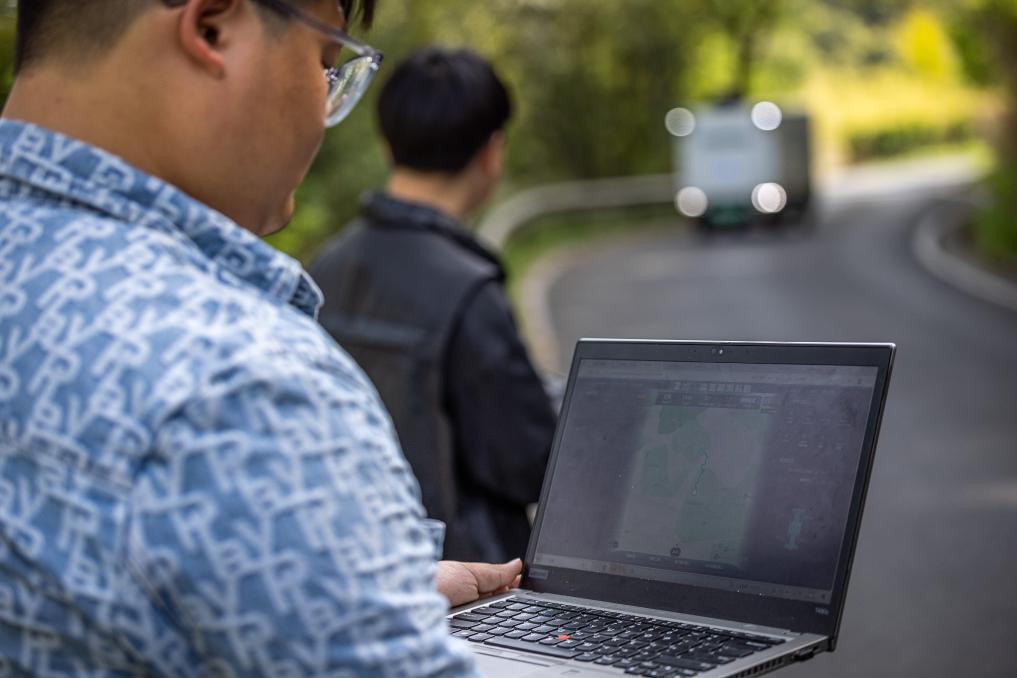 4月9日,工作人员在浙江省湖州市德清县莫干山镇劳岭村的测试现场核验智能无人物流车的现场数据。