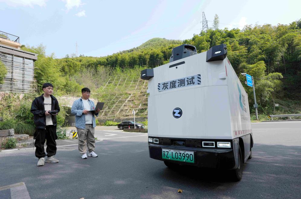 4月9日,在浙江省湖州市德清县莫干山镇劳岭村,工作人员对无人物流车进行全场景测试。