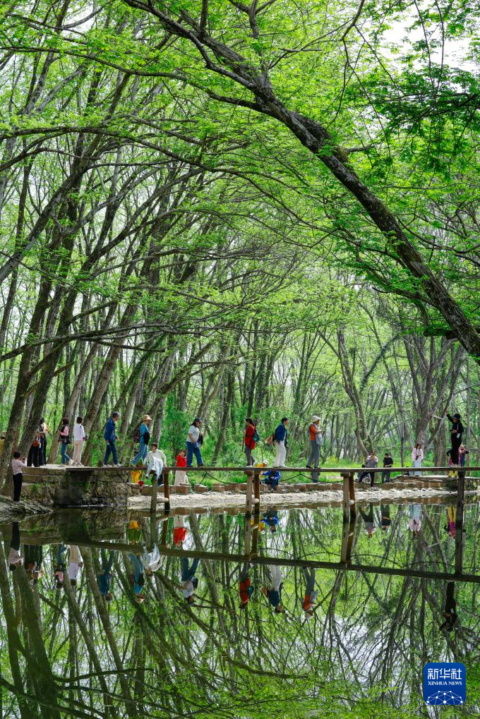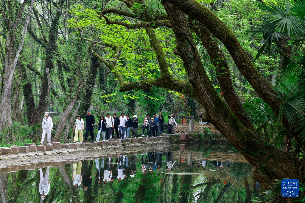 ↑2025年4月7日,游客在安徽省黄山市徽州区西溪南湿地游玩踏青。CICPHOTO/施亚磊 摄