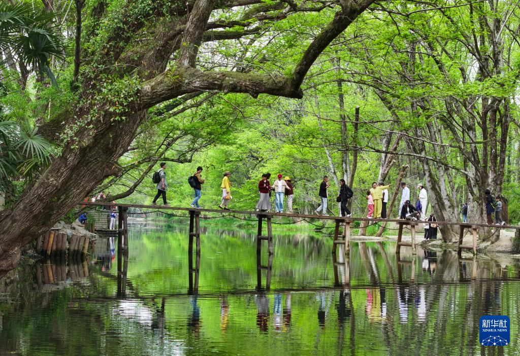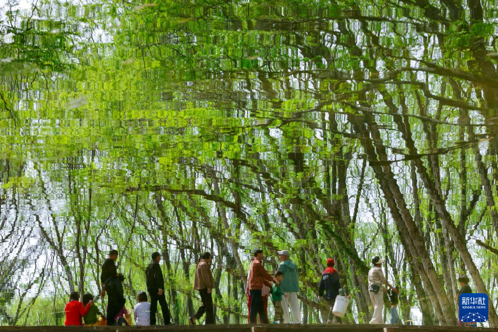 2025年4月7日,安徽省黄山市徽州区西溪南湿地春光明媚,枫杨林新芽吐绿,与延绵流淌的丰乐河相映成趣,春意盎然,宛如“绿野仙踪”。