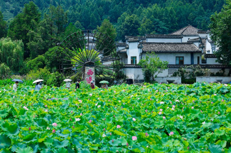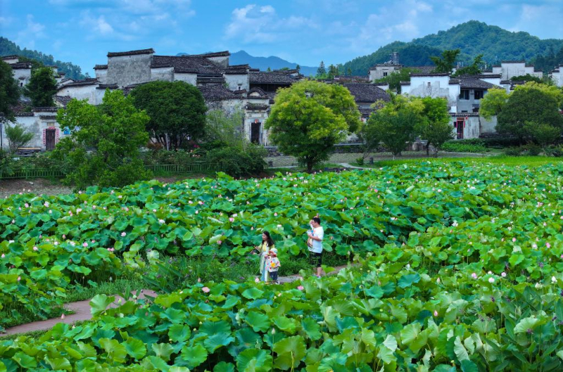 ↑2025年7月15日,游客在安徽省黄山市黟县西递古村观赏荷花。CICPHOTO/施亚磊 摄