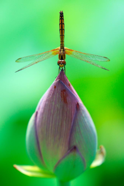 ↑2025年7月15日,安徽省黄山市黟县西递古村,一只蜻蜓在荷花上休憩。CICPHOTO/施亚磊 摄