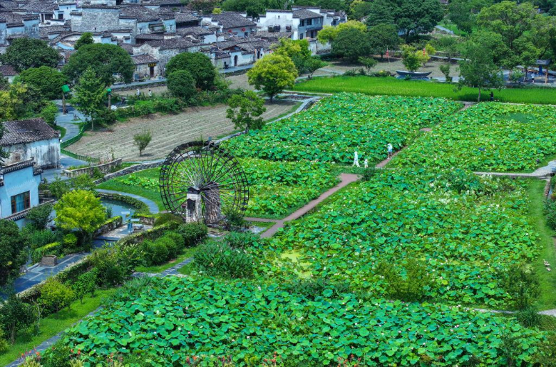 ↑2025年7月15日,游客在安徽省黄山市黟县西递古村观赏荷花。(无人机照片)CICPHOTO/施亚磊 摄