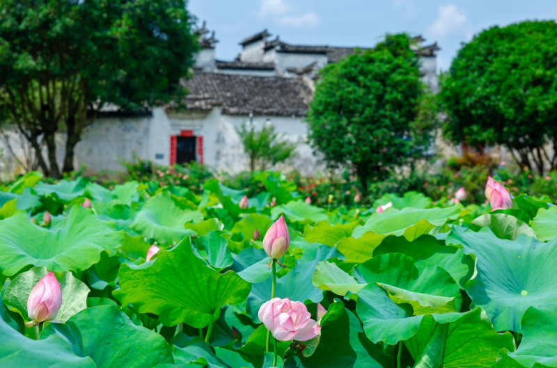 近日,安徽省黄山市黟县西递古村落的朵朵荷花渐次开放,娇艳欲滴,亭亭玉立,与徽派村落民居交相辉映,美不胜收,吸引了众多游客前来观赏。