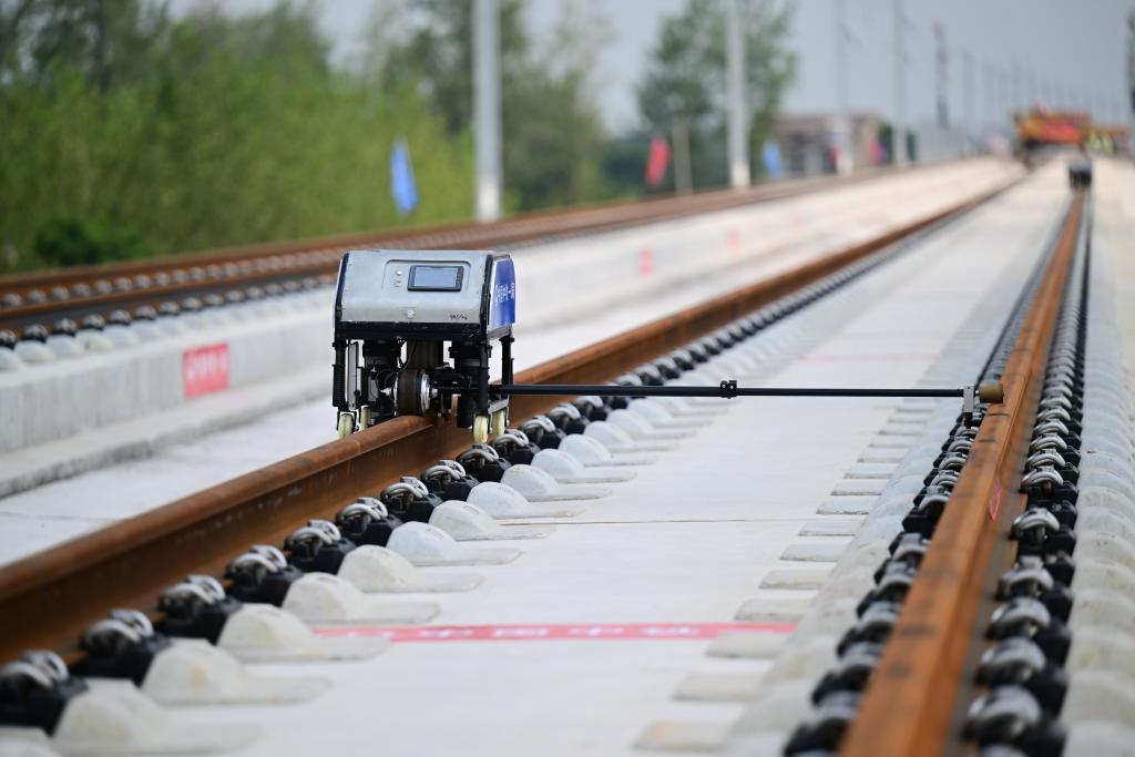 8月6日,智能螺栓机在淮宿蚌城际铁路铺轨施工现场自动作业。
