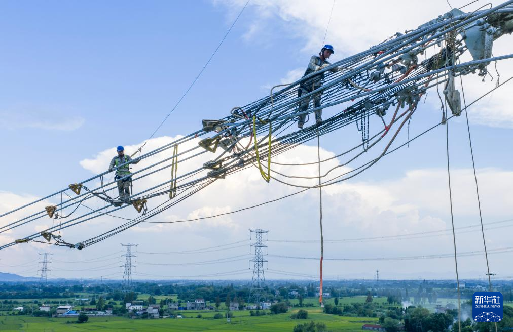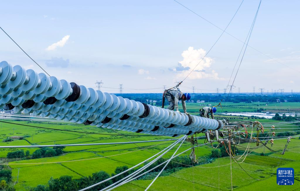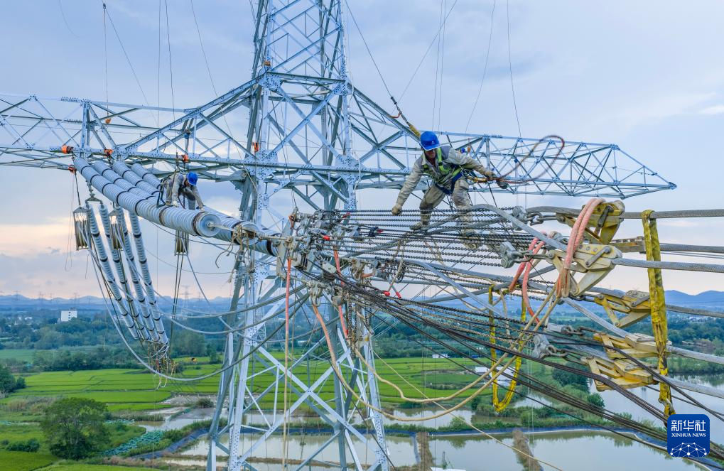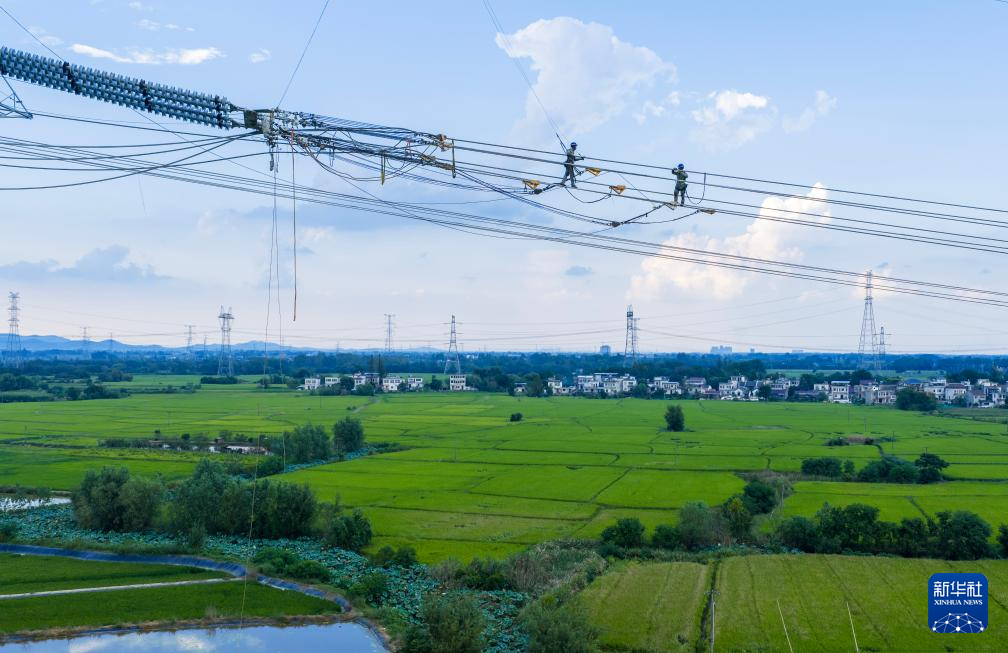 在安徽省芜湖市南陵县,安徽送变电工程有限公司施工人员在高空进行架线施工(9月16日摄,无人机照片)。