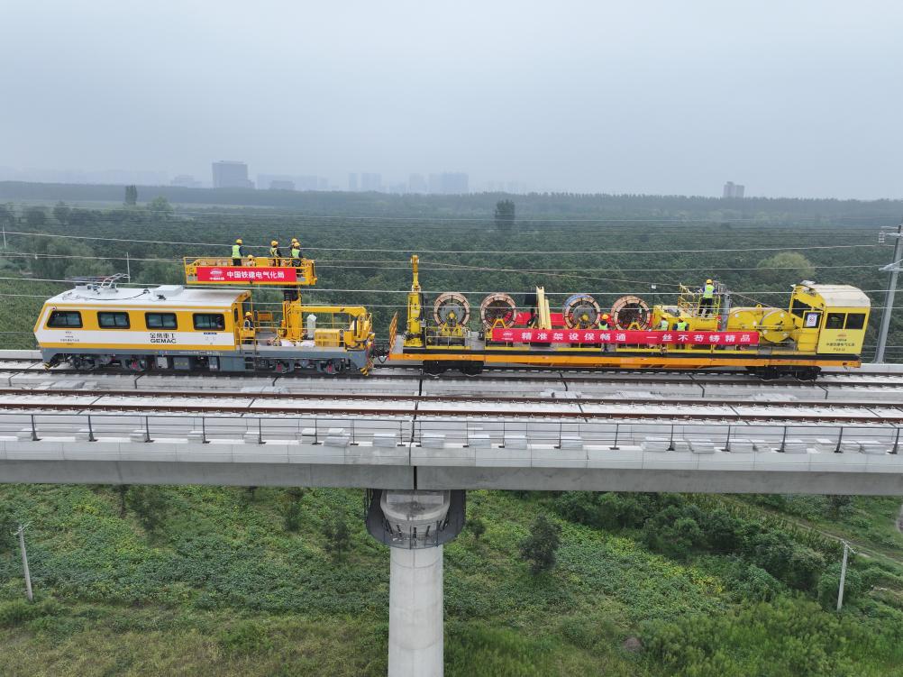 图为淮宿蚌城际铁路全线首条接触网导线架设现场。(中国铁建电气化局供图)