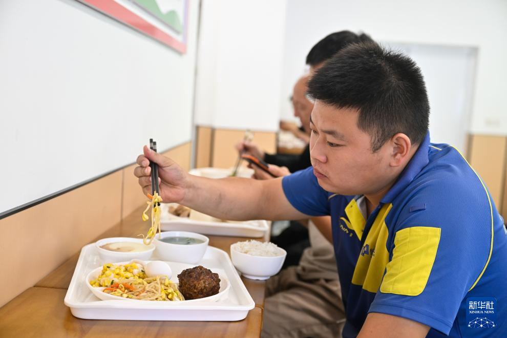 9月22日,居民在小米行大食堂用餐时和熟人聊天。