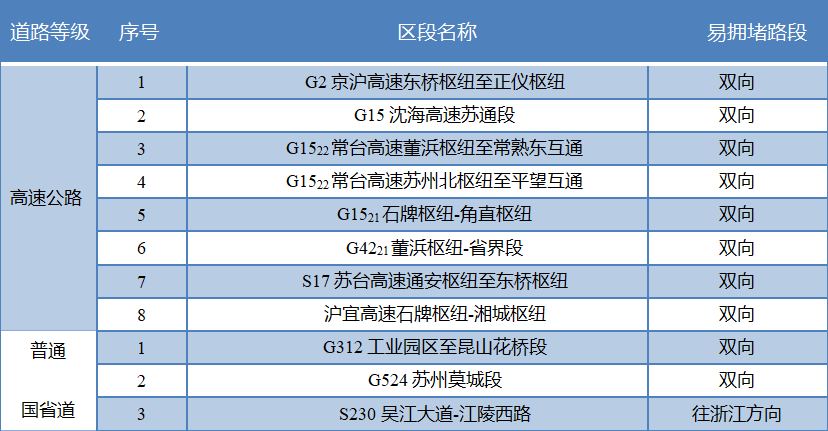 苏州市民预计将在国庆(中秋)假期前一天(9月30日)提前出行。从13时起,全市高速公路流量将开始攀升,高峰时段将出现在16-17时,最高小时断面流量预计达到7-8万辆。苏州市国省道流量预计自15时起开始上升,高峰时段出现在17-18时,最高小时断面流量预计达到1600-2100辆。国庆(中秋)假日期间,苏州市高速公路收费站高峰出行时段预计出现在10月1日10-11时,最高小时流量预计达到11.06-11.17万辆;苏州市普通国省道高峰出行时段预计出现在10月1日16-17时,最高小时流量预计达到2013-2029辆。预计苏州全市部分高速公路和普通国省干线大流量路段在国庆(中秋)假日期间会出现短时拥堵。