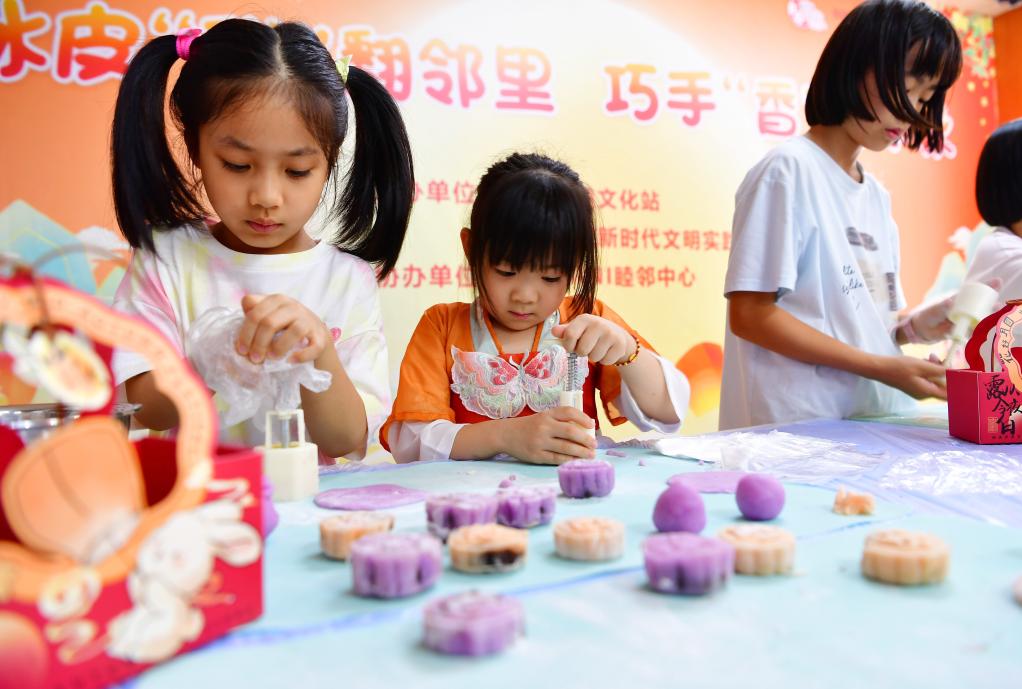 10月5日,在江苏省无锡经开区太湖街道方庙社区举办的迎中秋主题活动上,小朋友体验制作月饼。