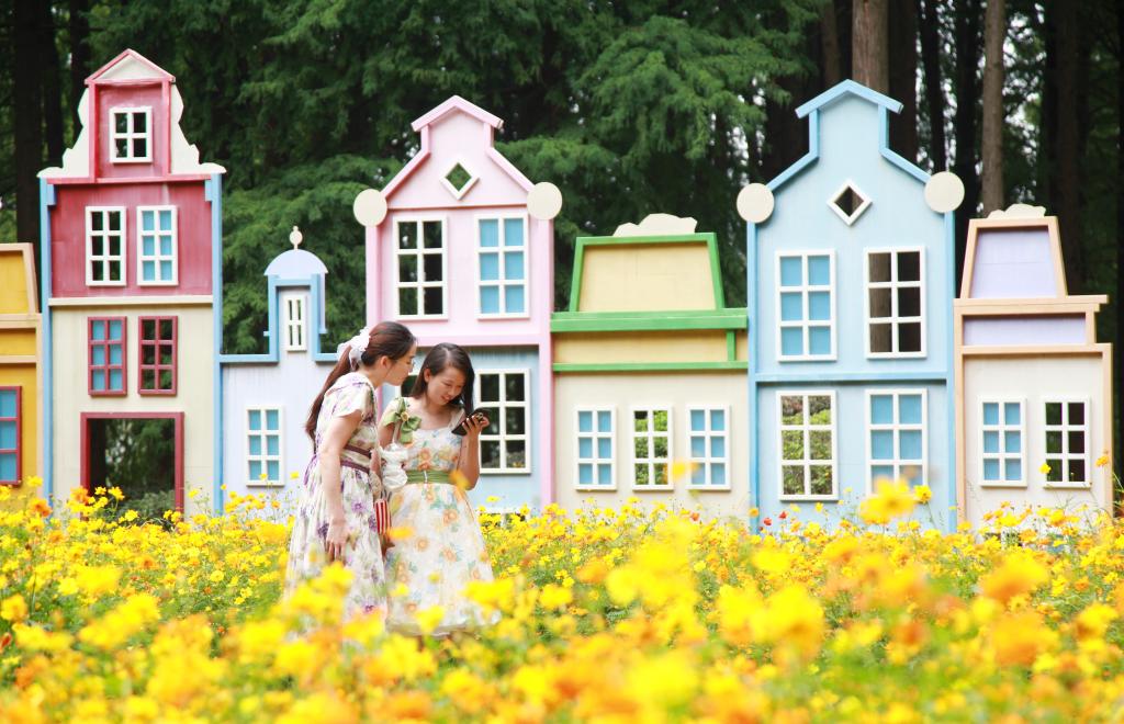10月5日,人们在南京中山植物园盛开的黄秋英花丛中赏花游玩。