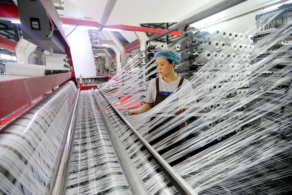 10月9日,工人在江苏省连云港市连云区一家编织袋生产企业生产线上忙碌。