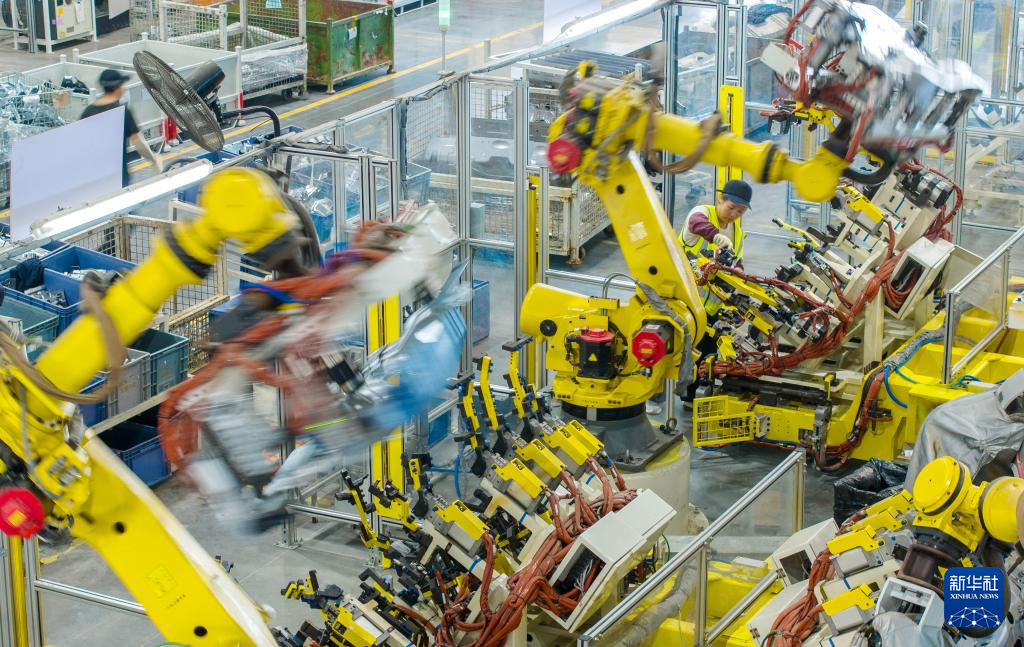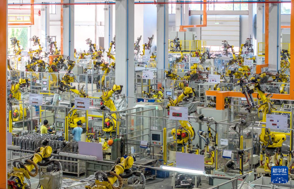 10月9日,浙江省湖州市长兴经济技术开发区的长兴地通汽车部件有限公司技术人员操控工业机器人生产新能源汽车配件(无人机照片)。