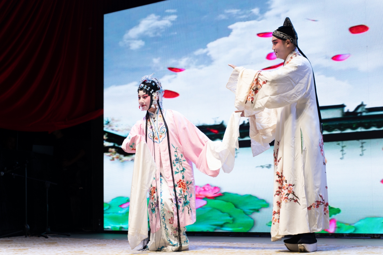 专业昆曲演员倾情演绎《牡丹亭·游园惊梦》选段,借“游园”“惊梦”经典场景,展现杜丽娘因《诗经》“关关雎鸠”萌动情愫的诗意刹那。昆曲身段与唱词字幕交织,呼应“诗与情”的主题,展现古典戏曲与唐诗的千年共鸣。终场环节,高校大学生朗诵团献上了《水墨江南·青春寻梦》。学子们以“四年前第一次踏上枫桥石阶”的青春视角,巧妙串联起“夜半钟声”“江枫渔火”“铁铃关”等经典意象,通过语言的演绎重现《枫桥夜泊》,生动展现了“古老石桥连接古今中外”的文化脉络。江南丝竹乐《枫桥夜泊》以箫独奏拉开序幕,逐渐与语言朗诵相融合,营造出“诗中有画,画中有乐”的沉浸式意境。大屏幕上缓缓浮现“愿诗歌与爱,如运河流水永续”的字幕,为这场诗会画上了温情的句点。