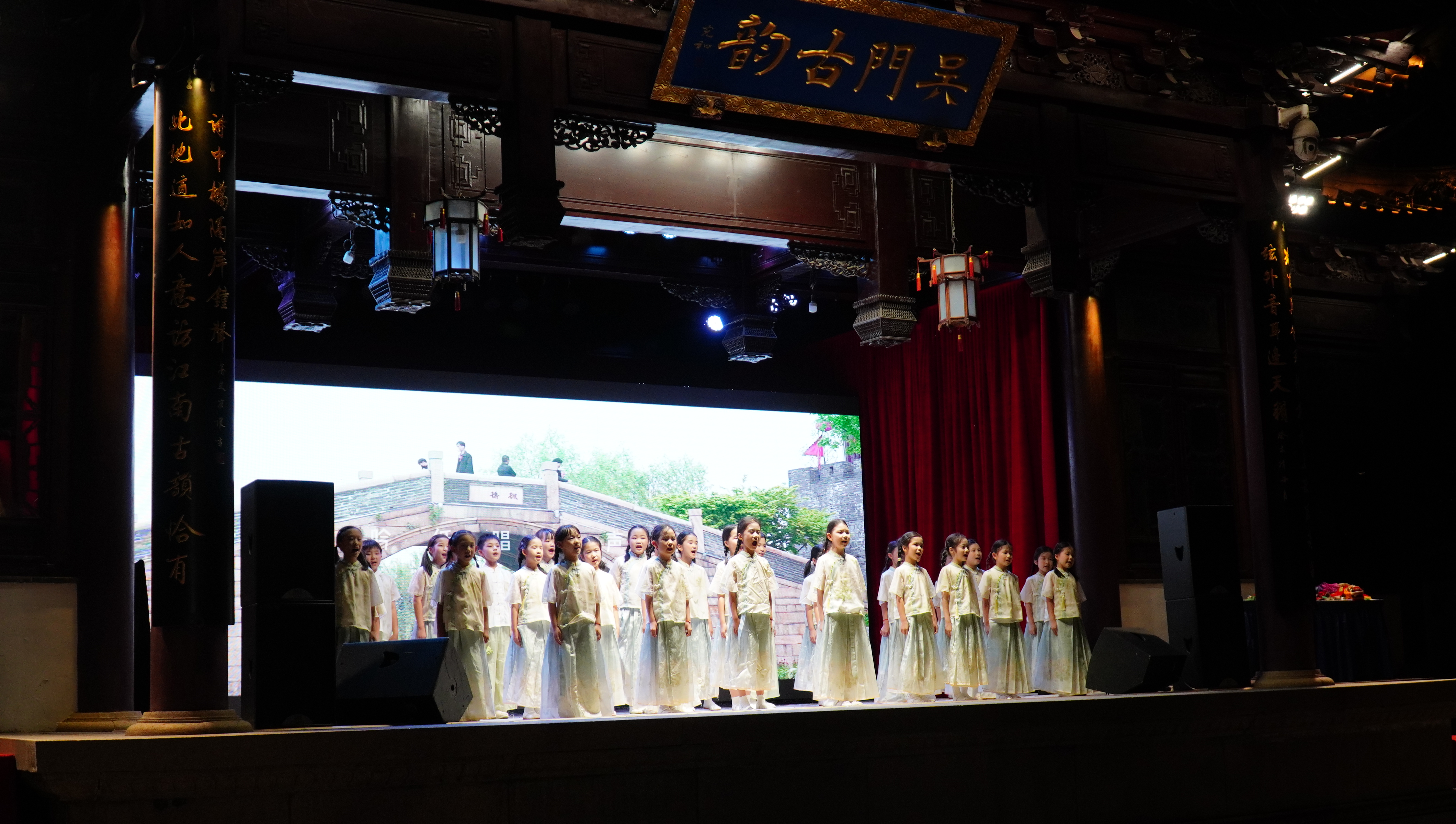 “唐朝的月依旧明,千年的诗传到今”——苏州市枫桥中心小学“枫之声”合唱团献唱原创校歌《枫桥夜泊》。童声合唱巧妙融合,保留“寒山寺”“钟声”等原诗意象,把“愁眠”之意转化为“莘莘学子情”,校史照片与枫桥实景投影交替闪现,定格“小学生与钟声”的传承画面。随后,福建厦门布袋木偶非遗传承人则以《木偶童趣》演绎大运河畔的生活智慧。木雕偶头的灵动表情与布制躯干的灵巧动作,让观众在指尖技艺中触摸非遗的温度。星悟空公益朗诵艺术团带来《游子吟·咏梅》融合表演。孩子们以灵动的手势舞诠释“临行密密缝”的亲情温暖,再以激昂的集体朗诵传递“待到山花烂漫时,她在丛中笑”的坚韧气韵。《我爱你中国》小提琴曲从轻柔到激昂的旋律递进,与寒山寺钟声特效交织。