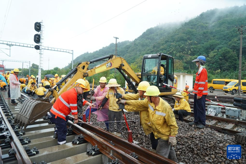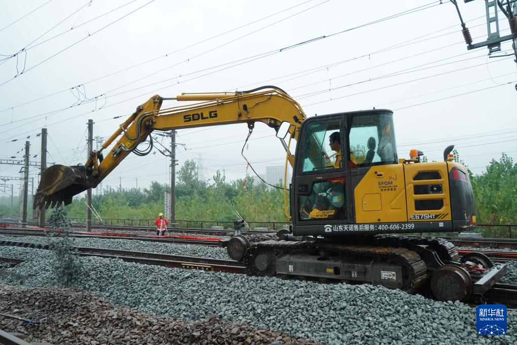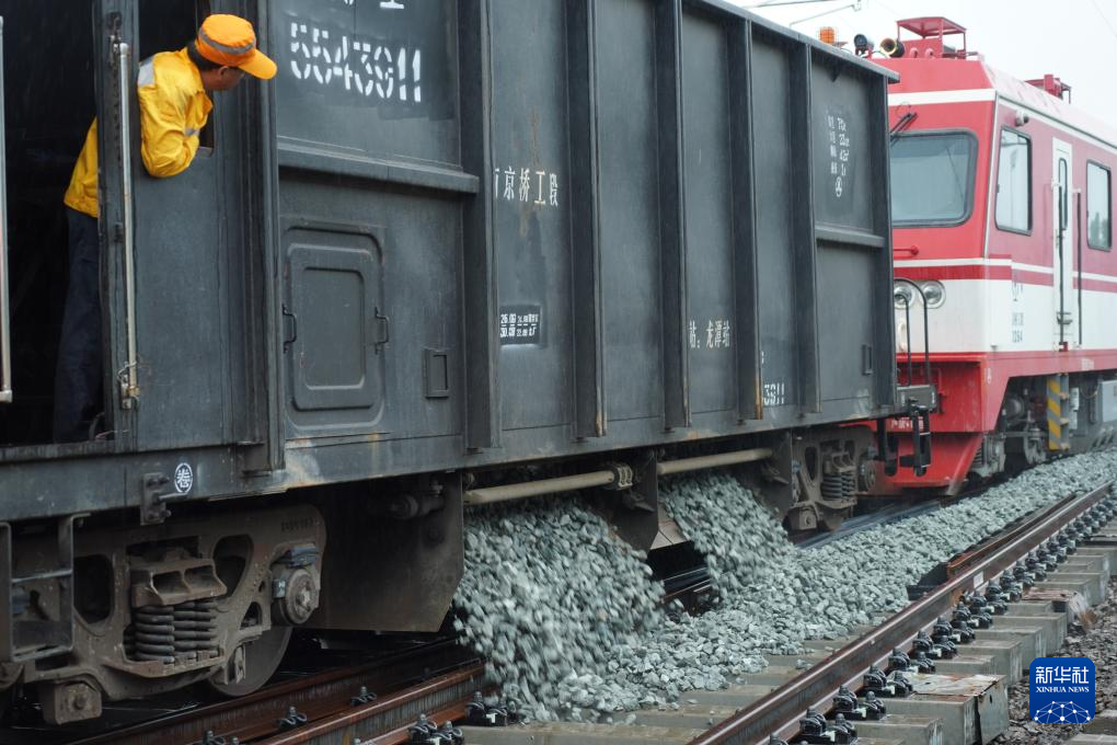 10月14日,工人在卸砟后利用挖机进行匀砟整理道床作业。