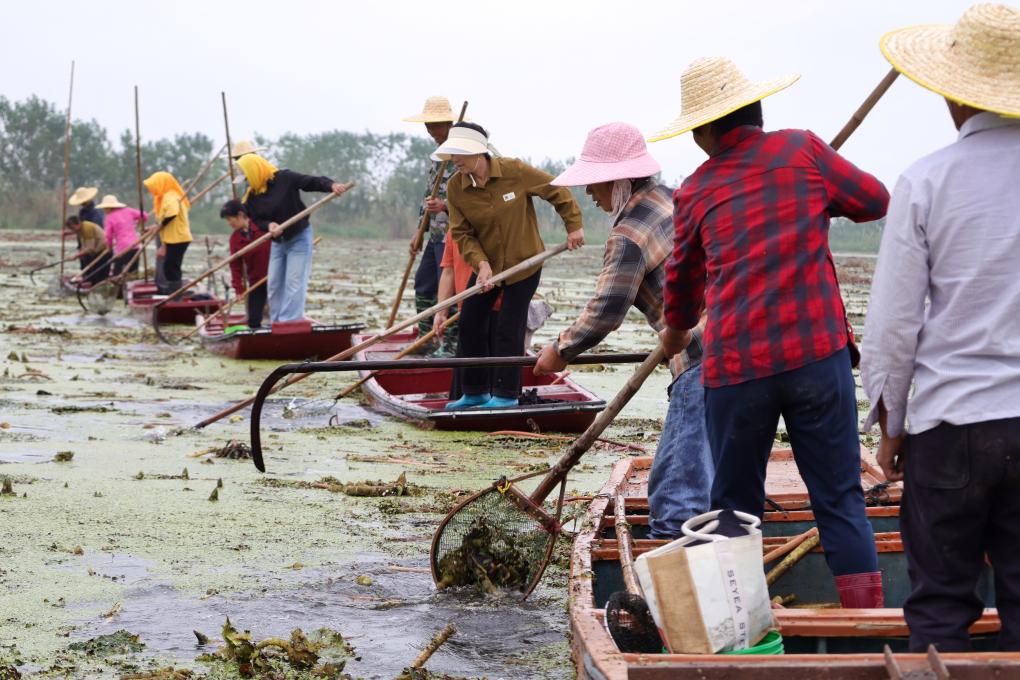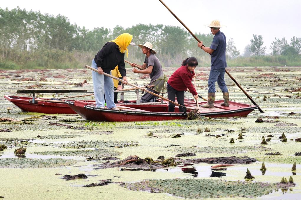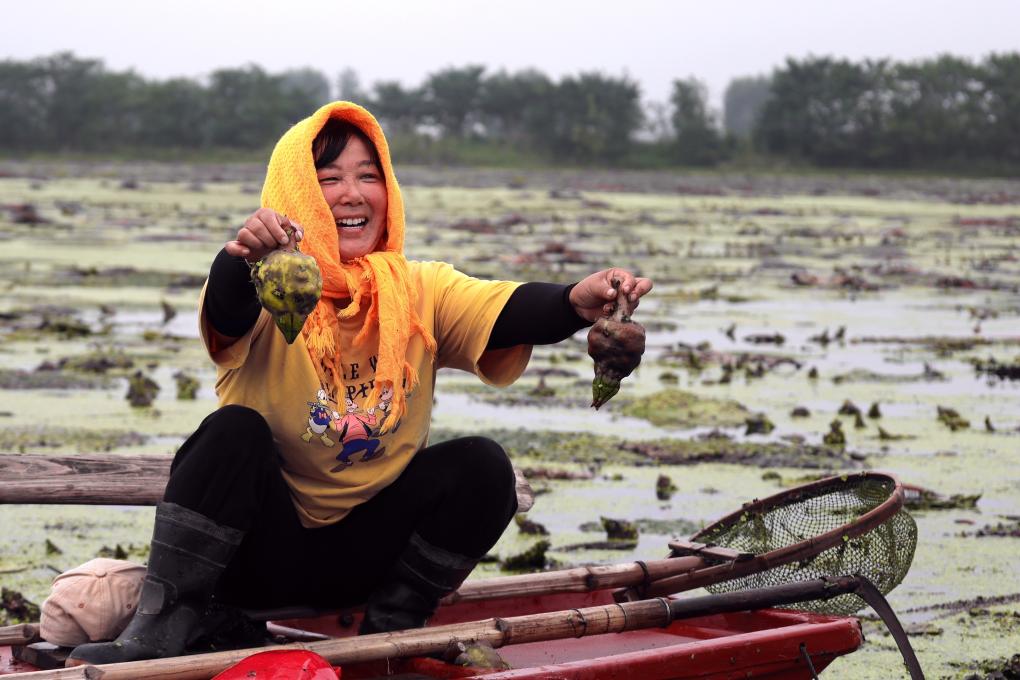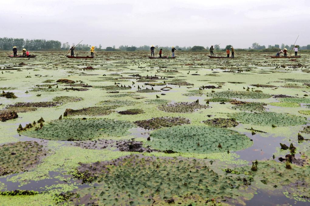 ↑2025年10月13日,江苏省盐城市建湖县九龙口镇九龙口村村民在采收芡实。CICPHOTO/李根 摄