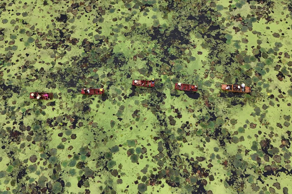 ↑2025年10月13日,江苏省盐城市建湖县九龙口镇九龙口村村民在采收芡实。(无人机拍摄)CICPHOTO/李根 摄
