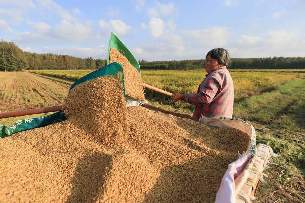 10月16日,在江苏省连云港市赣榆区城头镇中青墩村,种植户将收获的水稻装车。
