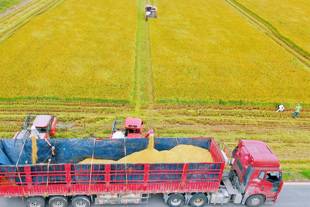 10月16日,在江苏省如皋市城北街道平园池村,农机手将收获的水稻装入运粮车(无人机照片)。