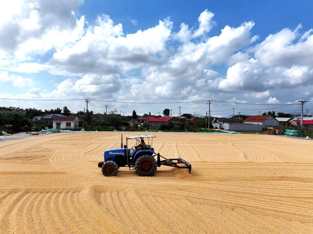 10月16日,在江苏省连云港市东辛农场,农机手操作机械翻晒玉米(无人机照片)。