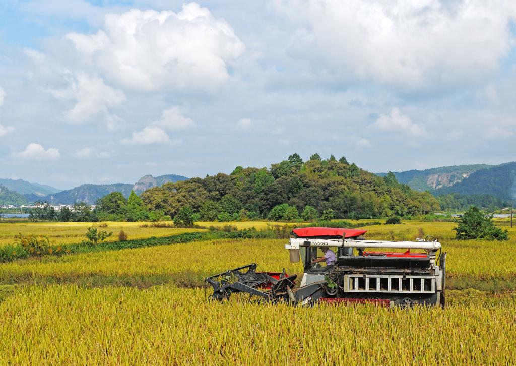 10月17日,在浙江省台州市仙居县双庙乡,农机手驾驶农机收割晚稻(无人机照片)。