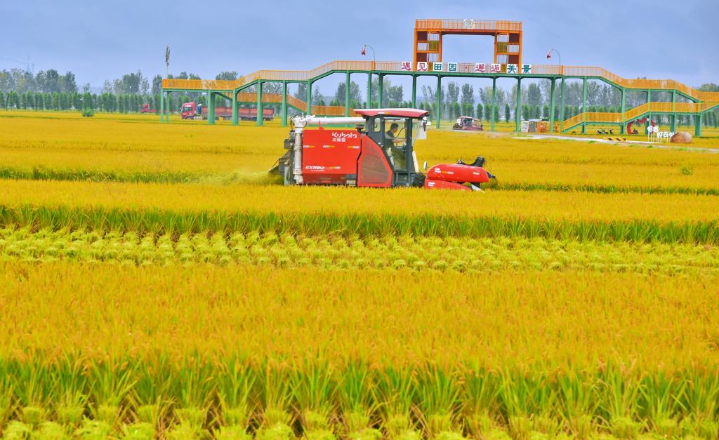 10月16日,在江苏省连云港市赣榆区城头镇中青墩村,种植户驾驶收割机抢收水稻。