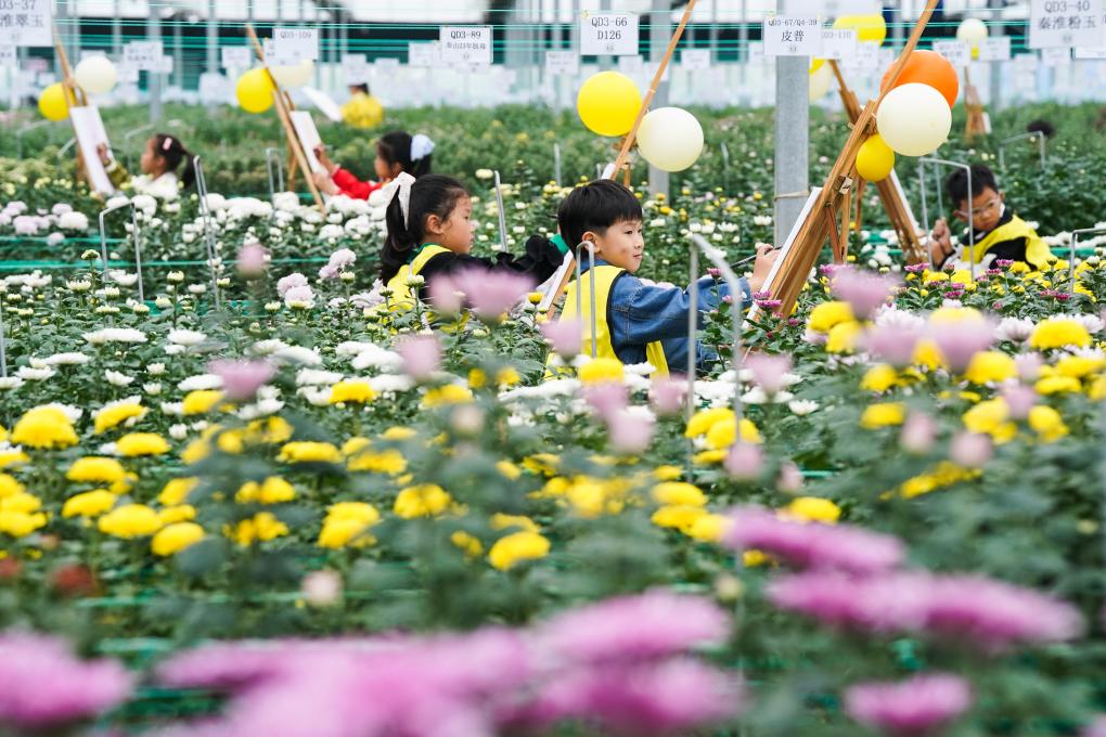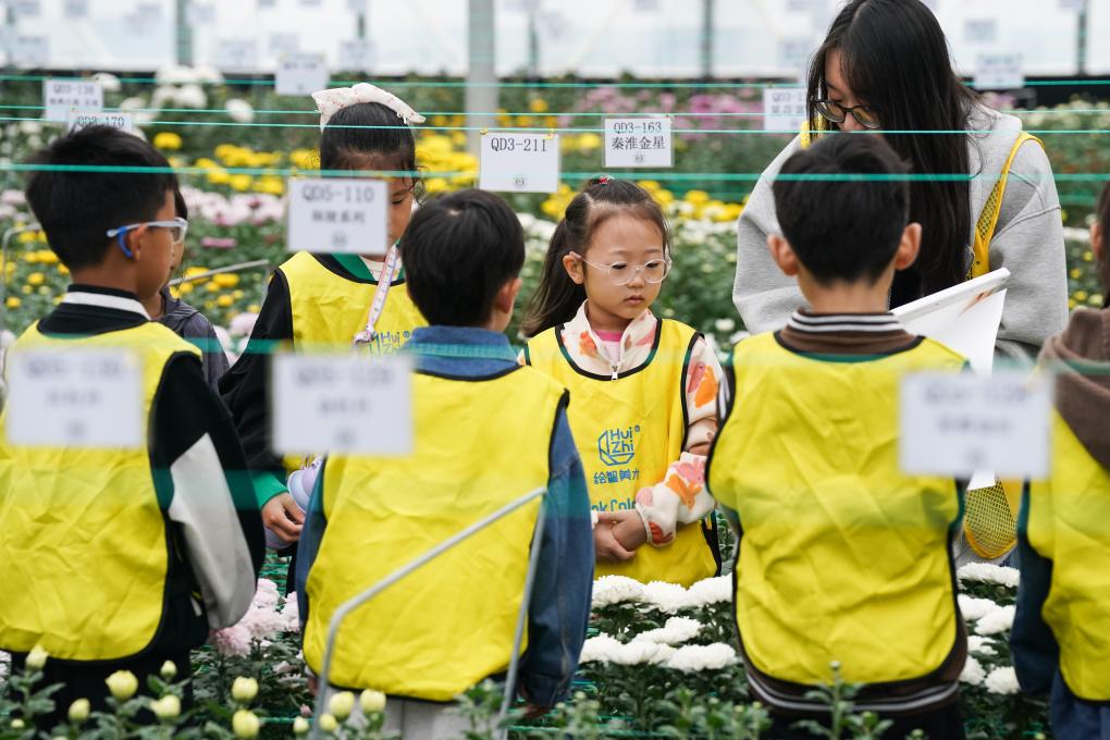 10月18日,小朋友在老师的带领下在全椒菊博园种植基地了解菊花。
