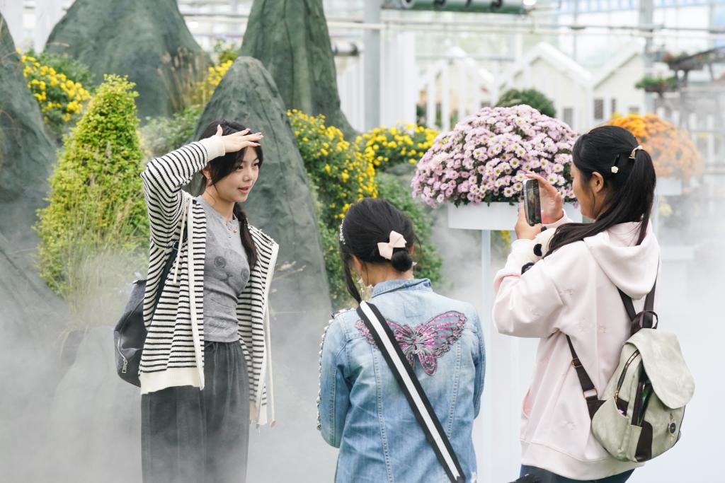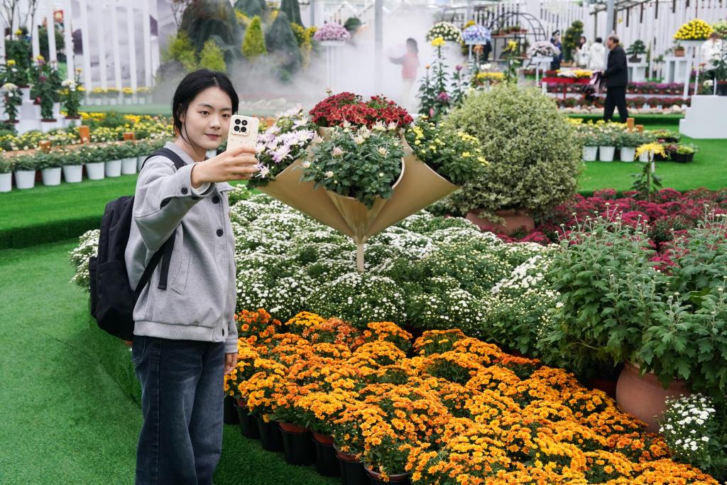 10月18日,游客在全椒菊博园展厅与菊花盆栽合影。