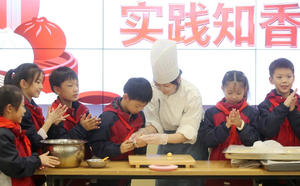 10月28日,在位于江苏扬州的中国淮扬菜博物馆,糕点师指导小学生制作重阳糕。