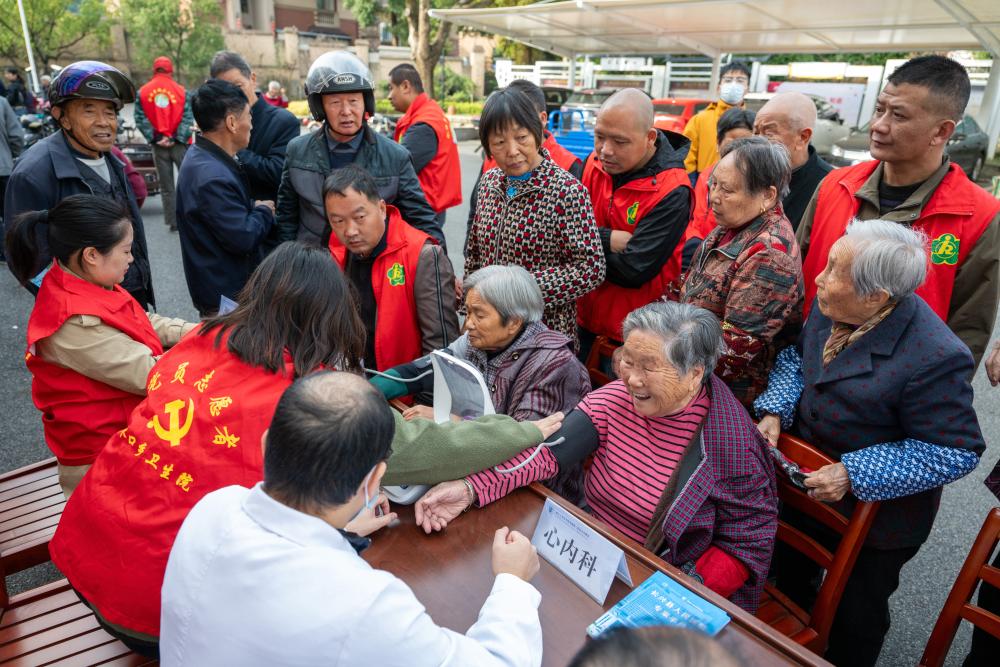 10月28日,在浙江省湖州市长兴县水口乡水口村,医护人员和志愿者为老人提供健康服务。