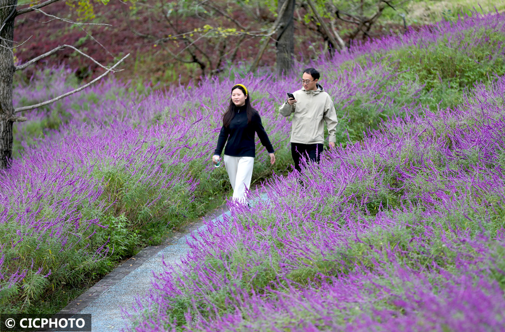 ↑2025年10月10日,人们在江苏省宿迁市三台山国家森林公园赏花游玩。CICPHOTO/孙明建 摄
