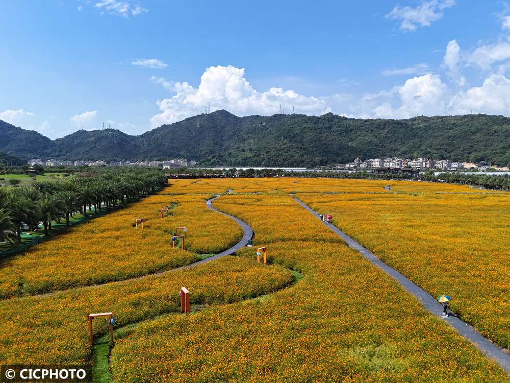 ↑2025年10月25日,人们在福建省福州市闽侯县祥谦镇五虎山郊野公园观赏百日菊。CICPHOTO/谢贵明 摄