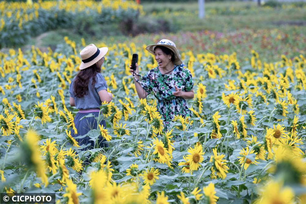 ↑2025年9月29日,人们在广西柳州市融安县浮石镇东江村葵花园拍照游玩。CICPHOTO/何华文 摄