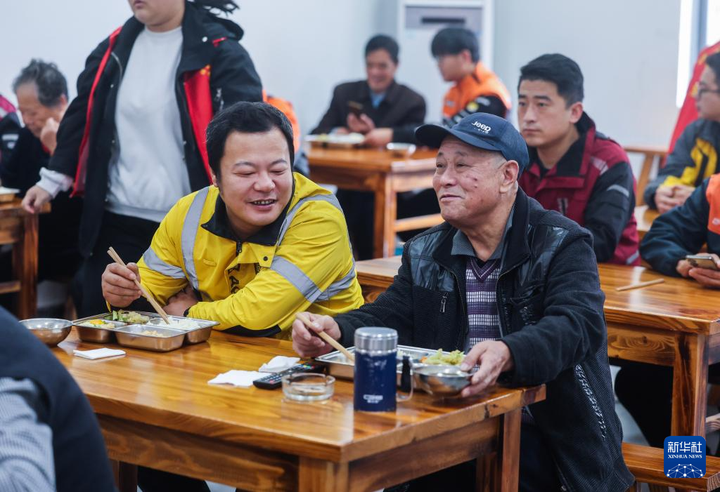 11月7日,在诸暨市陶朱街道祥云社区爱心食堂内,外卖员在品尝爱心餐时,与食堂里就餐的老人聊天。