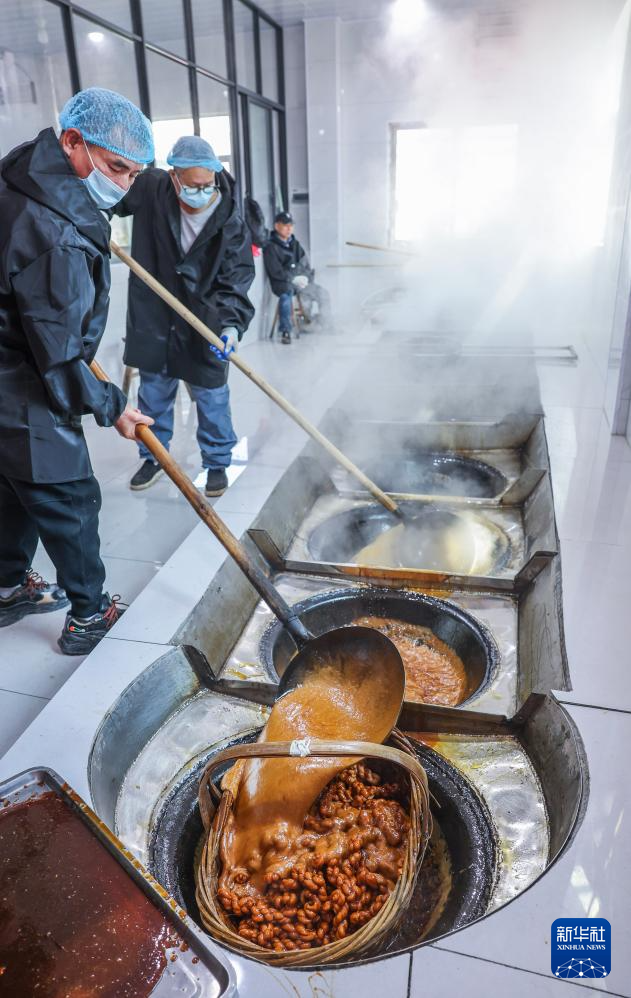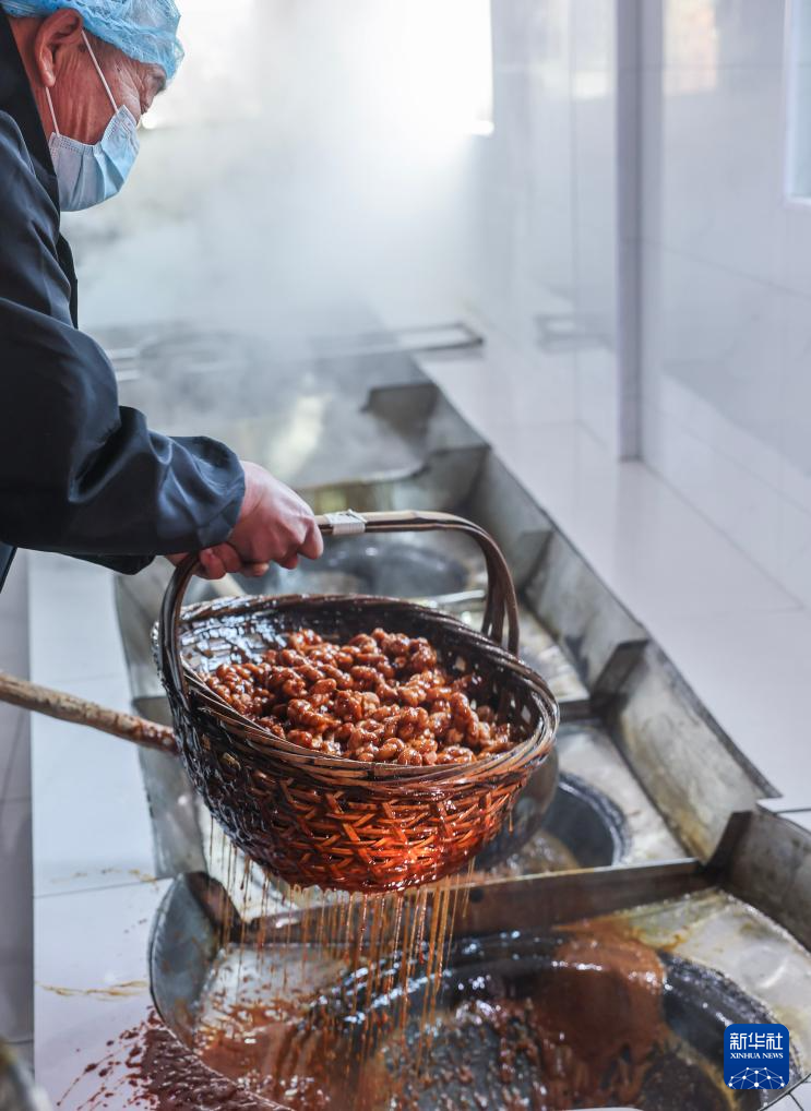 11月15日,义乌市城西街道上杨村铭悦红糖厂的工人将浓稠的糖蔗汁浇到麻花上,制成义乌的传统红糖美食——红糖麻花。