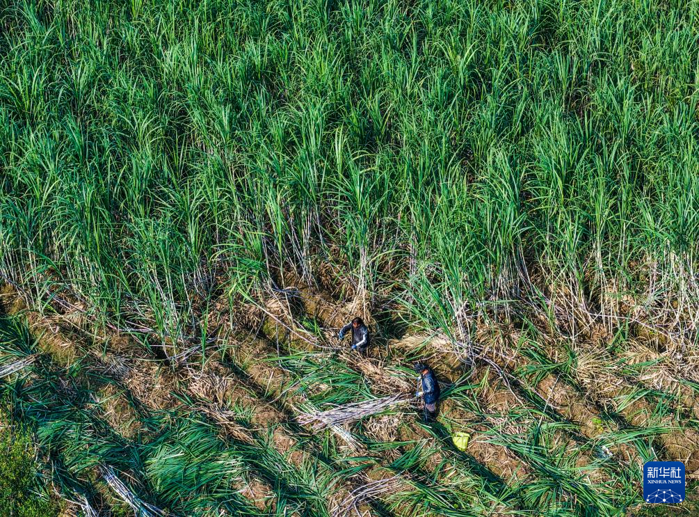 11月15日,工人在种植园中收获成熟的糖蔗,这是当地制作传统红糖的原材料(无人机照片)。