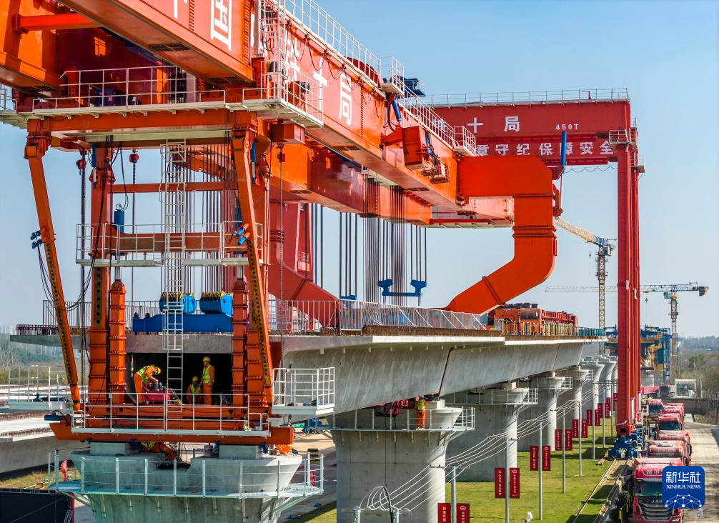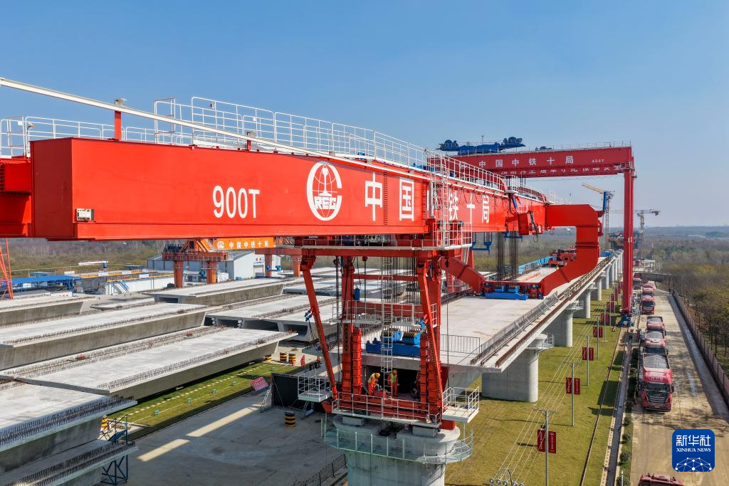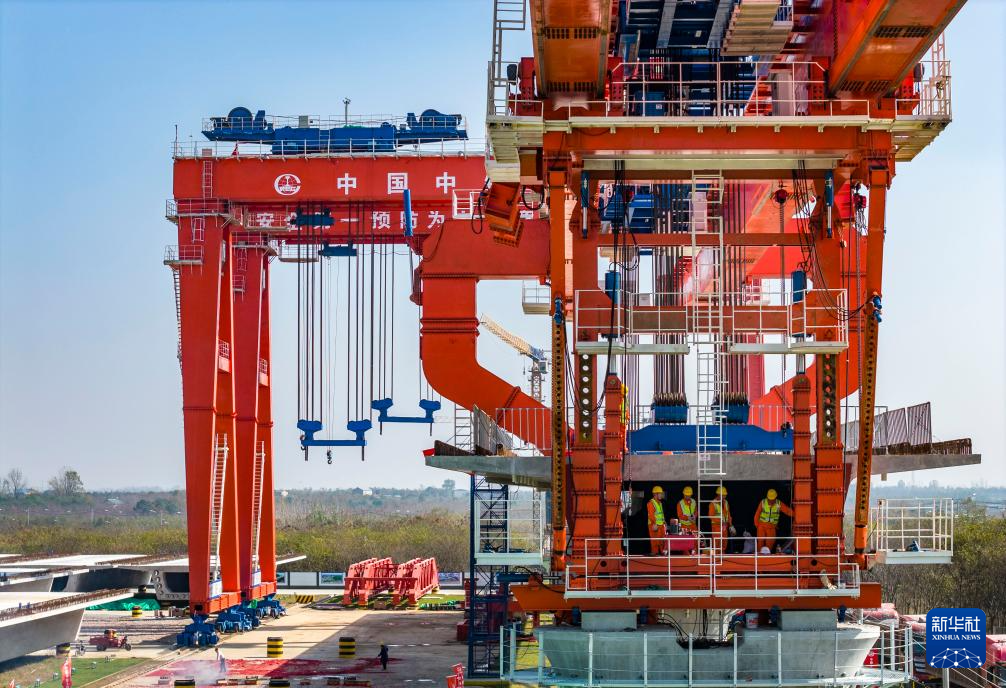 近日,合武高铁安徽段全面进入箱梁架设阶段,施工人员奋战在架梁一线,确保重点铁路工程建设进展顺利。