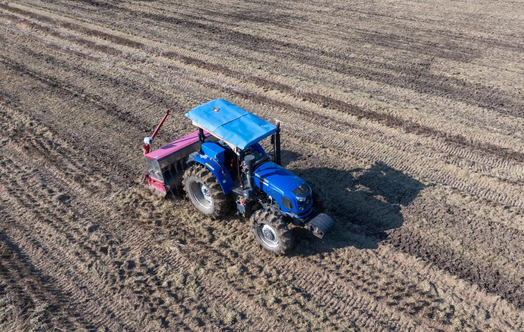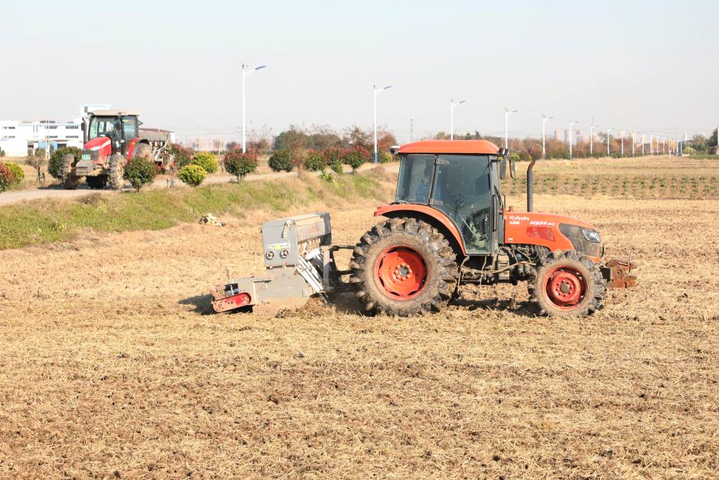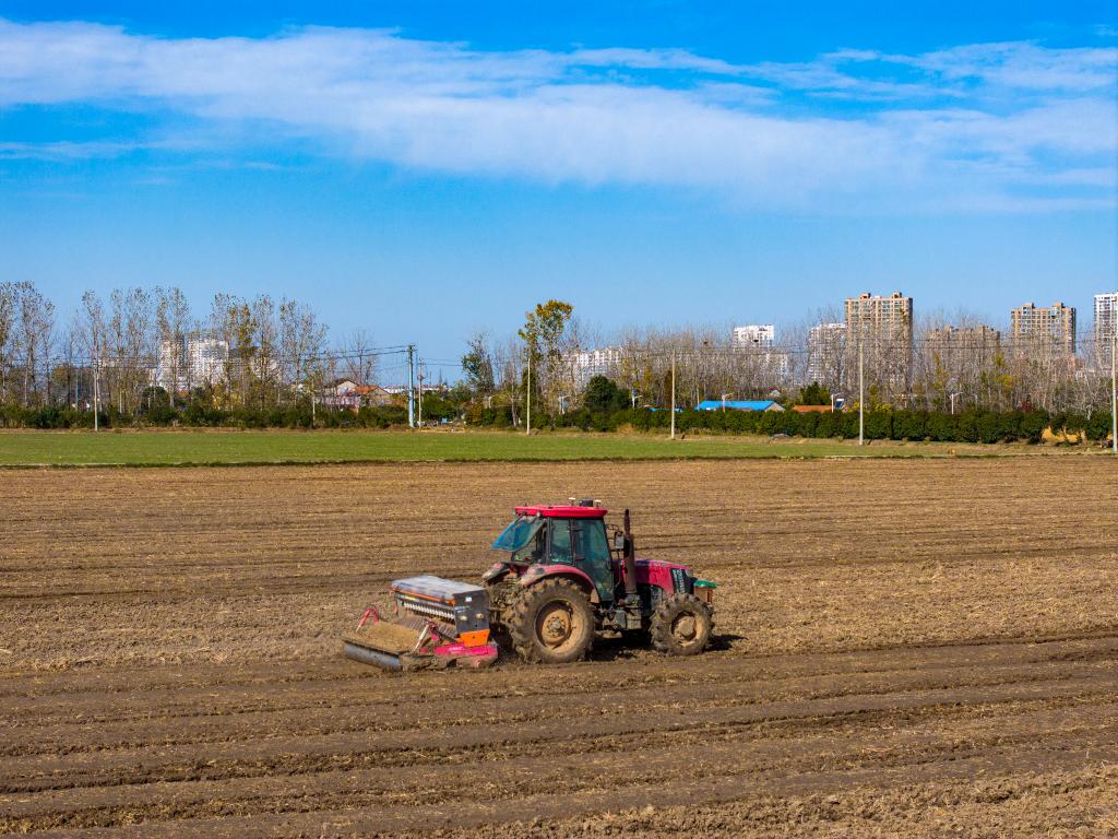 11月19日,在江苏省常州市金坛区金城镇,农机在田里播种小麦。