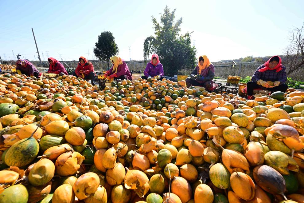11月19日,江苏省淮安市金湖县银涂镇十里果林千亩吊瓜园工作人员正在挑拣吊瓜。