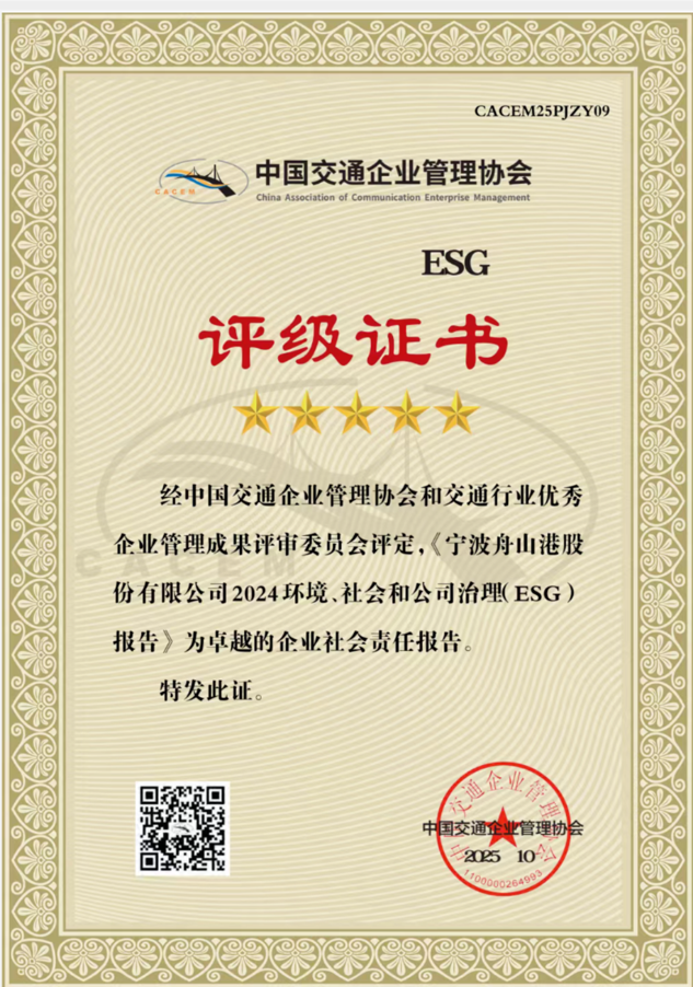 这些荣誉的获得,得益于持续而系统的ESG能力建设。浙江省海港集团、宁波舟山港集团近年来围绕“打造世界一流的ESG标杆和示范企业”目标,系统开展具有港口特色、与“双一流”建设相吻合的ESG工作,建立健全ESG管理制度体系,编制发布《股份公司ESG管理手册》,持续提升ESG管理规范化水平。2024年度ESG报告发布后,股份公司在Wind ESG评级中由BB级跃升至AA级,实现两年内“两连跳”式跨越。