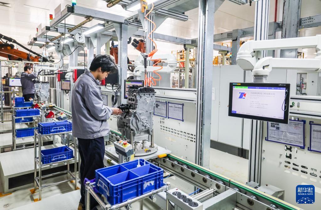 11月27日,在位于金华市金东区的浙江骊勒新能源有限公司的生产车间内,流水线上正在加工新能源汽车的智能增程器。